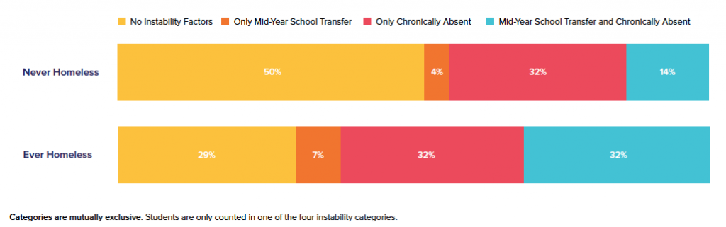 - Homeless students were much more likely to experience instability factors such as midyear school transfers and chronic absenteeism. Less than a third (29%) of homeless students experienced neither of these instability factors, compared to half (50%) of students who were never homeless during high school.