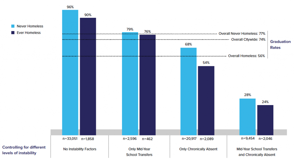 When there are no instability factors present, all students regardless of housing status graduated at rates of at least 90%, far higher than the citywide average of 74%. However, the majority (71%) of homeless students experienced at least one instability factor compared to only half (50%) of their never-homeless peers.