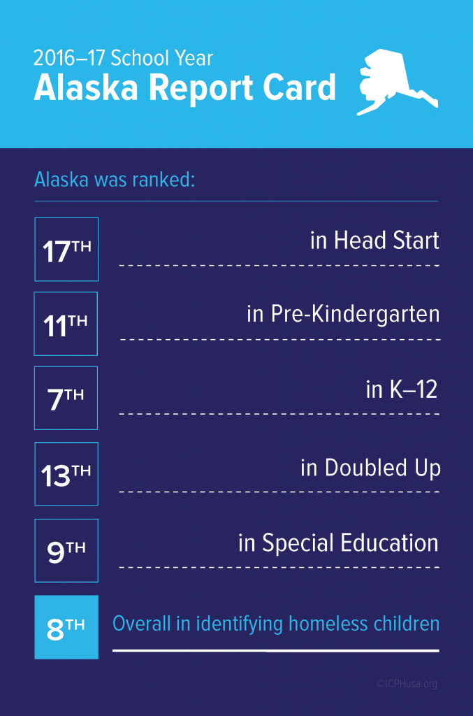 Alaska identified 4,041 homeless students in SY 2016–17. Homeless students made up 3.0% of total enrollment. The state was ranked 8th overall in identifying homeless students, dropping from SY 2013–14 when Alaska was ranked 1st in identification.