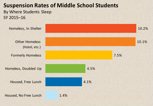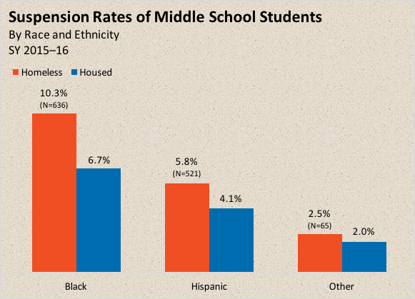 A deeper dive into suspension rates of middle schoolers shows that homeless students who are black, male, or living in the shelter system were most at risk of getting suspended from school.