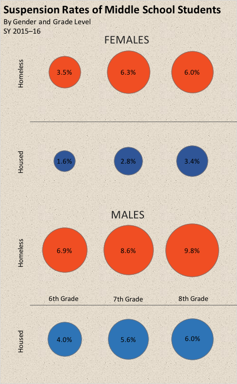 One in 10 (9.8%) homeless male students in 8th grade were suspended compared to 6.0% of their grade-level peers who were housed. Female students were suspended at lower rates than their male classmates, but the same trend continued—those experiencing homelessness were suspended at much higher rates. In fact, female students who were homeless saw twice the suspension rate as their housed peers throughout their middle school years.