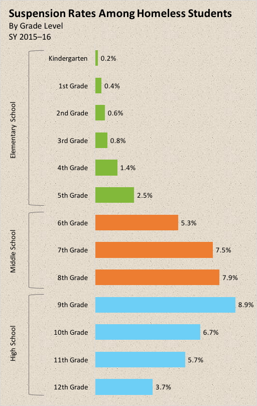Homeless students are suspended at every grade level. In elementary school, relatively few homeless students received a suspension. By the time students enter middle school, as illustrated in the chart below, their risk of suspension doubles: from 2.5% in 5th grade to 5.3% in 6th grade. By 8th grade, the suspension rate for homeless students rose to nearly 8%. Homeless 9th graders were at the highest risk of being suspended—9%, or one in every 11 students, received a suspension that year. The first year of high school is a critical turning point, and when students are suspended they are more likely to disengage from school and less likely to receive their diploma.