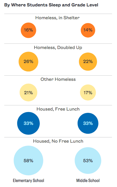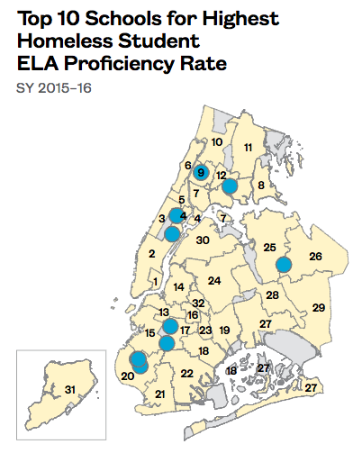 Children living in homeless shelters face some of the most extreme educational challenges, since they often transfer schools mid-year and rack up many school absences. Even when they can remain in the same school, children who are homeless often have trouble getting assignments done at the shelter, don’t have Internet access where they are staying, or simply have trouble getting to school on time due to a long a commute. A social work director interviewed for our recent Atlas explained, “one middle school student [age 13] who was interviewed said that traveling from the Bronx to school in Brooklyn caused him to go from an A average in English to a 67% due to being late. His younger brother [age 8] really struggled to get up in time to get on the train for school, and he would often fall asleep in class. Last year, his teacher became concerned that he might have a sleep disorder because he was constantly nodding off. He missed out on a lot of valuable classroom instruction and he was moved to a special education classroom.”