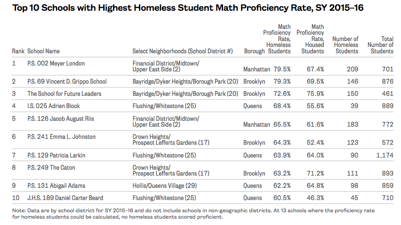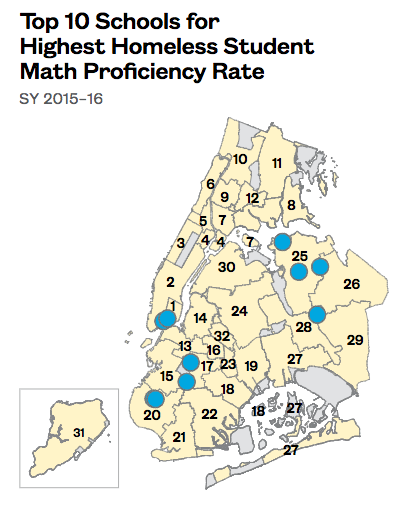When looking at state assessment scores for elementary school students, we see that children living in shelters are more likely to fall behind. Less than one in five students living in shelter scored proficient citywide—half the rate of housed students who were low income and one-fourth the rate of housed students who were not low income. What’s more, this pattern persisted across the whole city—in all of New York City’s 32 public school districts, as well as the citywide special education district, students living in shelters scored lower on state math assessments than housed students of all income levels. Statistics like this leave many wondering, how can schools turn this troubling trend around?