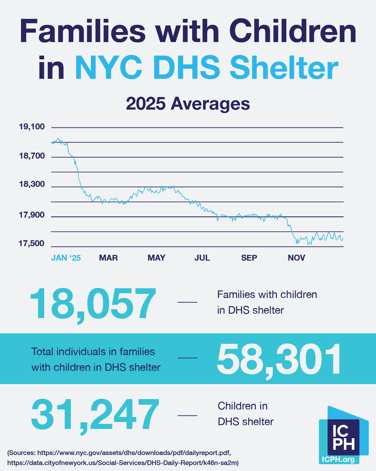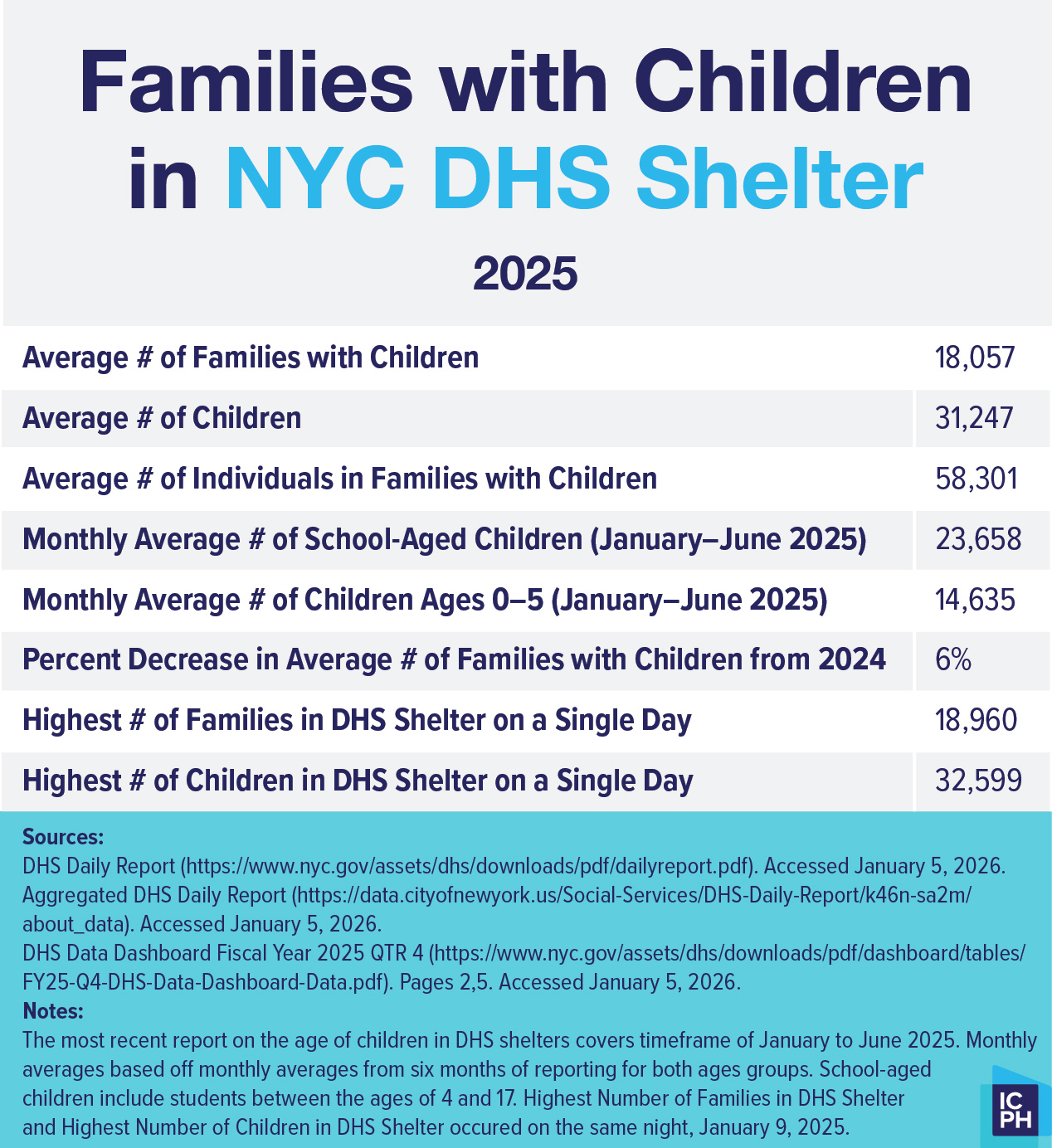 - Department of Homeless Services. “DHS Daily Report.” https://www.nyc.gov/assets/dhs/downloads/pdf/dailyreport.pdf. Accessed January 5, 2025. DHS makes PATH application data available on DHS Daily Report, these reports are not archived or published every day. Calculation for the average number of PATH applications in 2025 is based on 236 published reports archived by ICPH.