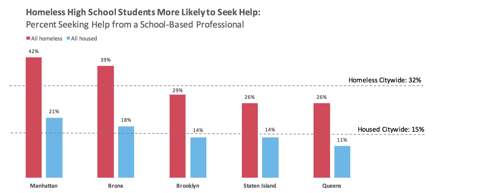 Despite these sobering numbers, when availed of the opportunity, homeless students seek help. In fact, high schoolers who experience homelessness are twice as likely as their housed classmates to report receiving help for an emotional or personal issue from a professional at school (32% vs. 15%). This trend stands across all five boroughs, and helps to illustrate the important role that schools can play in supporting the needs of homeless students. Some schools have counselors, social workers, and therapists who are available to help students through their mental health challenges. Others have School-Based Health Centers (SBHCs), which provide students with primary health care and mental health services either on site or by referral.