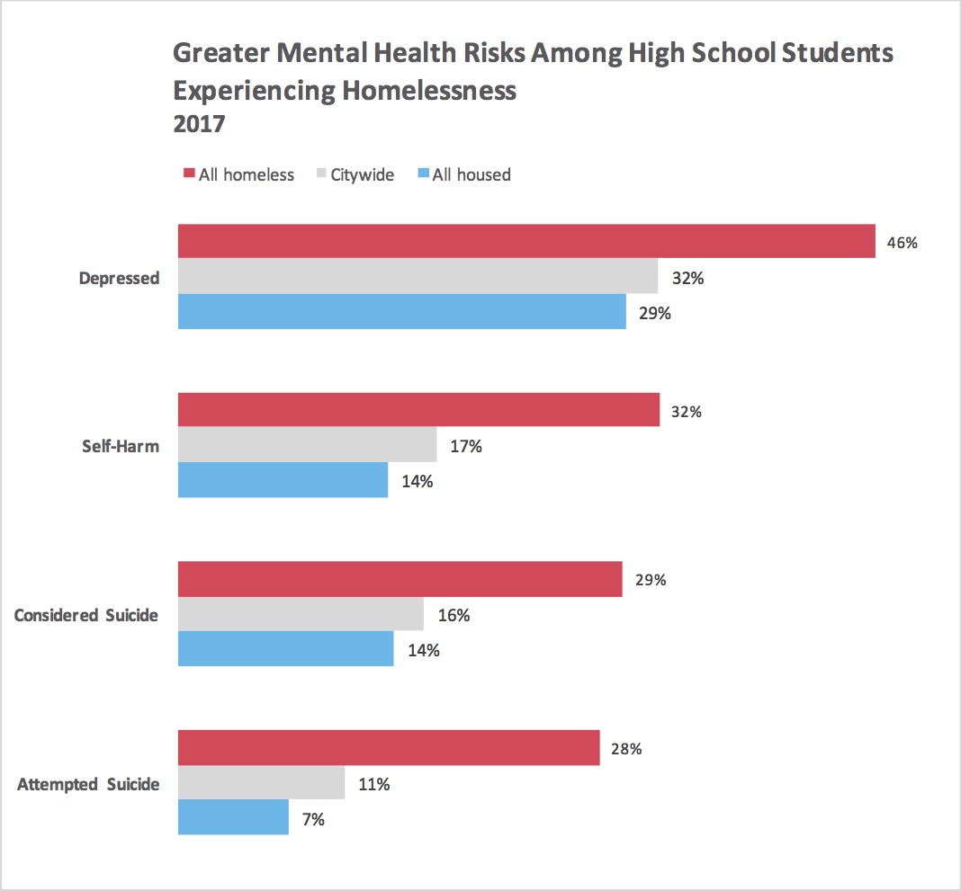 After years of steady decline, suicide rates among high school students are on the rise, with suicide now ranking as the second-highest cause of death among adolescents aged 15–19. Adolescence is a transitional stage of life and the day-to-day challenges faced during this time can be overwhelming for many, placing them at heightened risk of depression, self-harm, and even suicide. These years can be particularly difficult for homeless high schoolers, who are also dealing with the many challenges that often accompany housing instability—anxiety related to not having a safe and permanent place to live; persistent sleep deprivation, hunger, dating and family violence; academic setbacks; and feelings of isolation—placing them at even greater mental health risk than their housed peers.