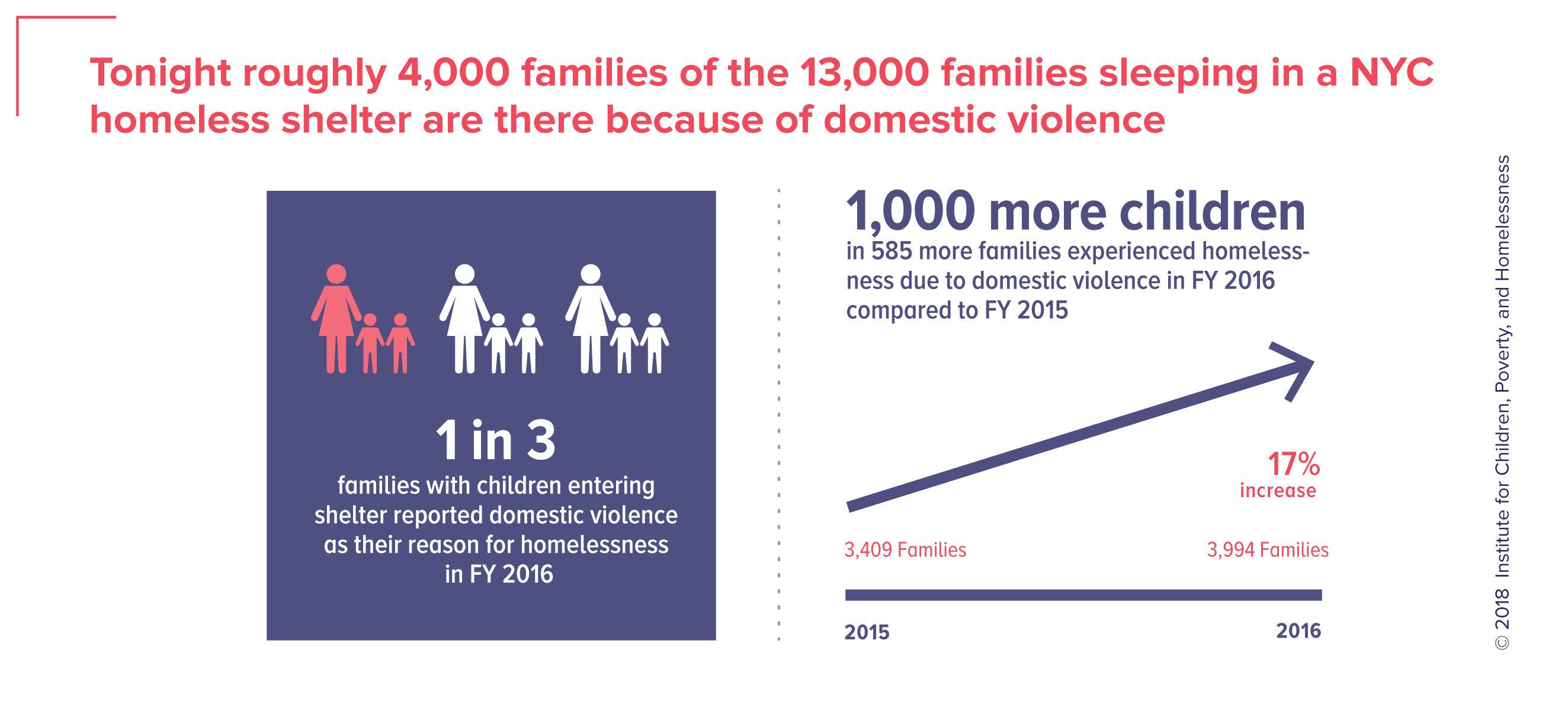 In New York City, where child and family homelessness is at an all-time high and growing, domestic violence has consistently been among the leading causes of family homelessness.  In FY 2016 alone, approximately 4,000 families and an estimated 7,000 children were homeless because of domestic violence. While shocking, these figures do not capture the totality of NYC families with children that experience housing instability due to domestic violence, such as the unquantified number of families living doubled-up after fleeing their abusers, or the additional 1,152 families and 2,000 children, that were served in specialized domestic violence emergency shelters in June 2016 alone.