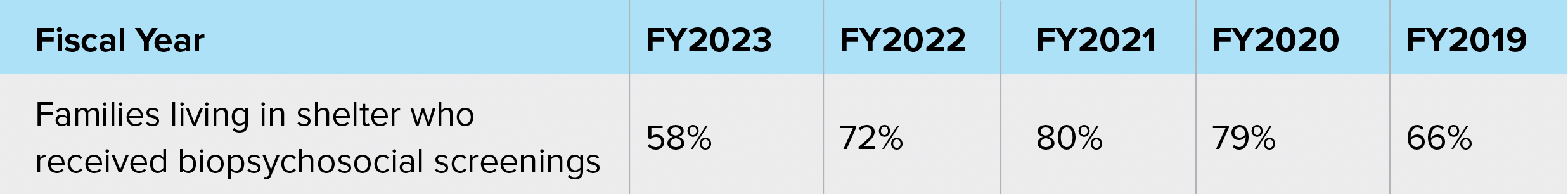 Perhaps the most troubling of the metrics included in DHS’s section of the MMR this year is the large decrease in the percentage of families who received biopsychosocial screenings from shelter-based mental health clinicians. These evaluations identify any behavioral health and developmental challenges that may create barriers for a client to secure permanent housing so that shelter staff can connect clients to appropriate services. Just 58% of families received a screening, compared to 72% in FY2022. This is the lowest rate in the last five fiscal years. The MMR notes that this decrease is due to the higher shelter population and a shortage of social workers. While that may be the case, the percentage had also decreased between FY2021 and FY2022, signaling that this is perhaps a trend and not just the result of this fiscal year’s particular challenges. It will be important to note how the City reports this metric in subsequent MMRs, as legislative changes have gone into effect that should lead to more families receiving mental health care while in shelter.