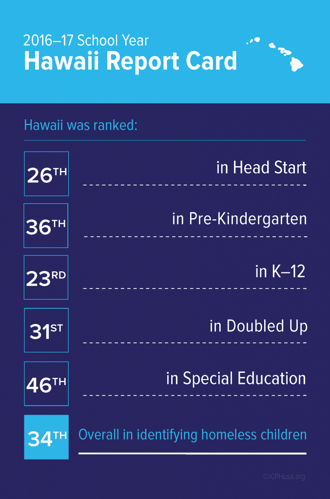 Hawaii identified 2,958 homeless students in SY 2016–17. Homeless students made up 1.6% of total enrollment. The state was ranked 34th overall in identifying homeless students, improving from SY 2013–14 when Hawaii was ranked 43rd in identification.