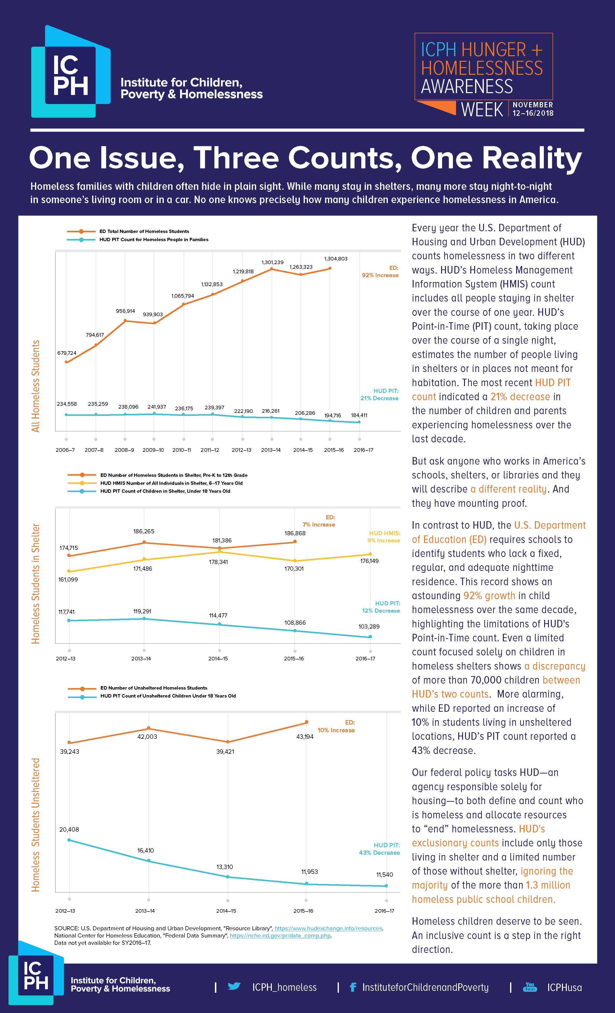 Homeless families with children often hide in plain sight. While many stay in shelters, many more live night-to-night in someone’s living room or in a car. No one knows precisely how many children experience homelessness in America. This infographic will help you understand why an inclusive definition of child homelessness is required to give homeless children the visibility and support they deserve.