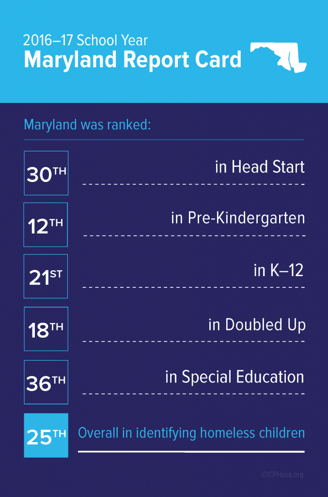 Maryland identified 17,122 homeless students in SY 2016–17. Homeless students made up 1.9% of total enrollment. The state was ranked 25th overall in identifying homeless students, dropping from SY 2013–14 when Maryland was ranked 17th in identification.