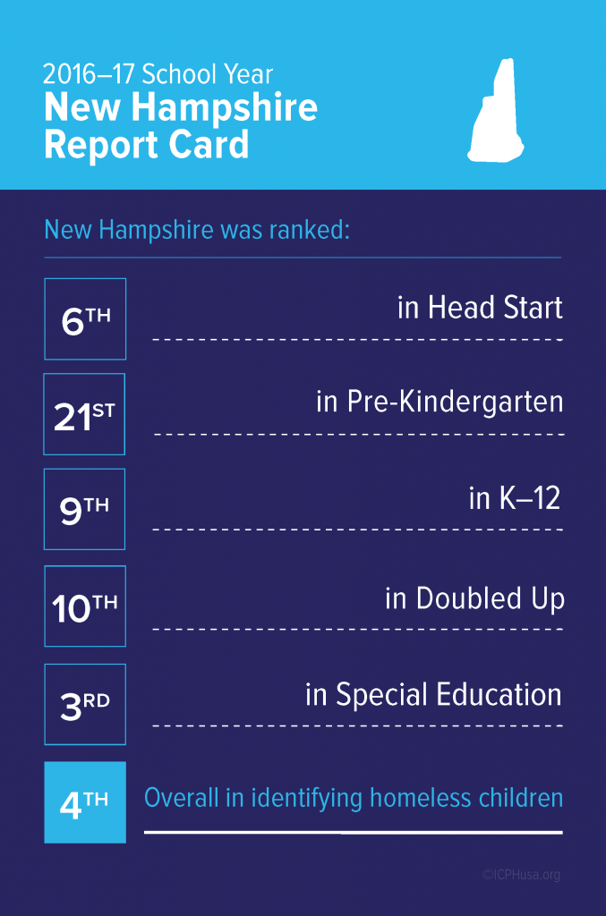 New Hampshire identified 3,913 homeless students in SY 2016–17. Homeless students made up 2.2% of total enrollment. The state was ranked 4th overall in identifying homeless students, improving from SY 2013–14 when New Hampshire was ranked 13th in identification.