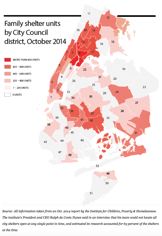 “Setting aside concerns about the quality and availability of such services, some experts say there can be political advantages to using hotels and private apartments. Opening a Tier II shelter is a more time-consuming process, and communities tend to be be more aware of the proposal – and have more time to try to thwart it. These traditional shelters are also a more visible reminder of homelessness – and how well any given administration is handling it, according to Ralph da Costa Nunez, president of the Institute for Children, Poverty and Homelessness. The Bloomberg administration “didn’t want to have these more state-regulated facilities because it makes the issue much more visible,” de Costa Nunez said. “So they expanded the cluster sites and the hotel sites. And what’s happened is that became the norm. They’ll put people there because it’s easy. They’ll put people there because they really don’t always get counted.”