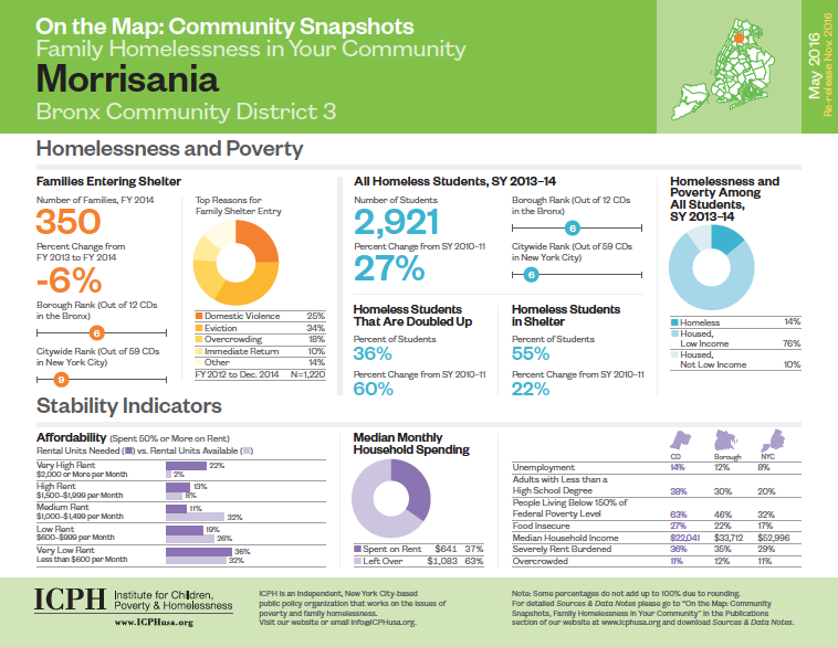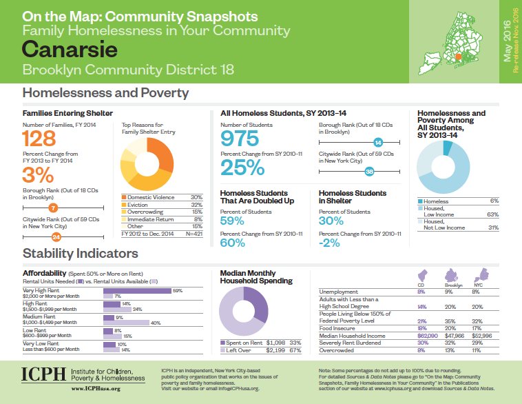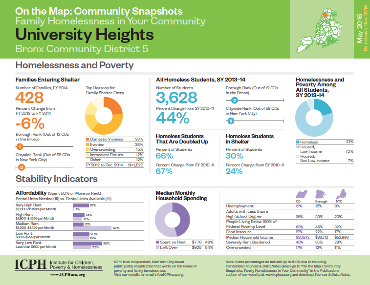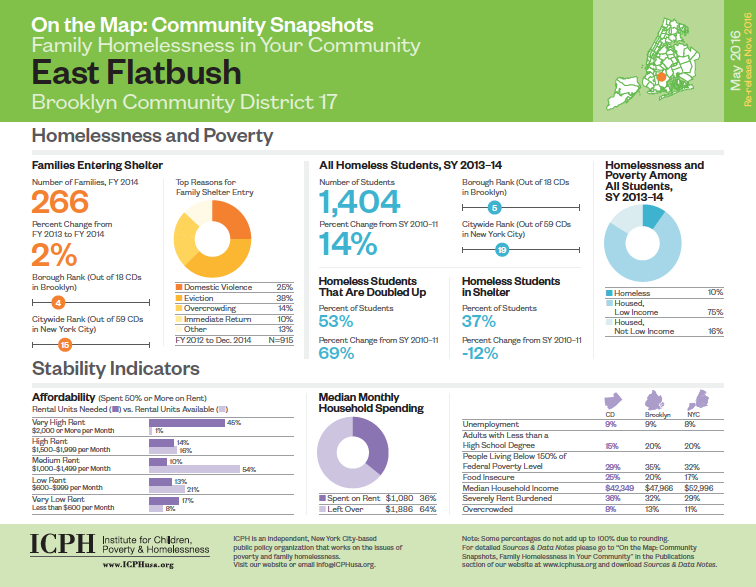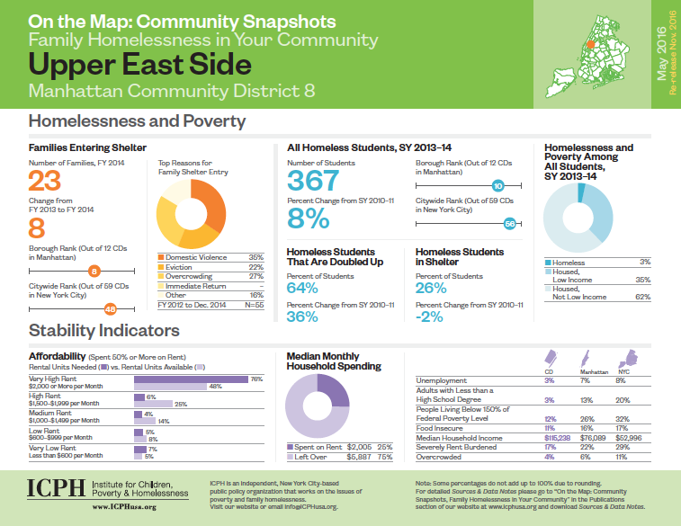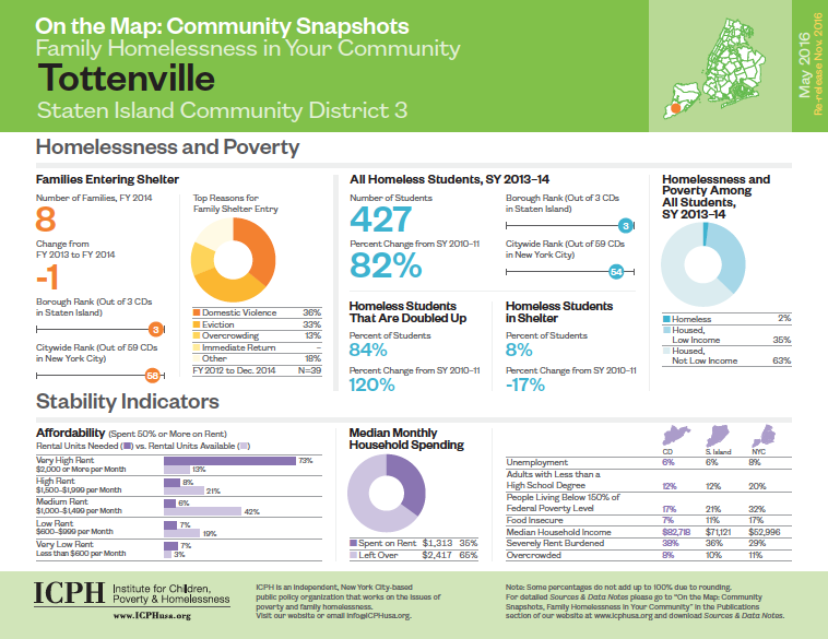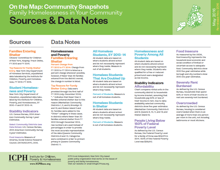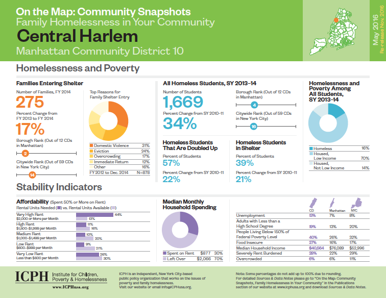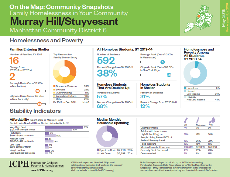 On the Map: Community Snapshots continues the work of our On the Map series by providing quick, one-page snapshots that look at the key factors impacting family homelessness at the community level. This helpful resource examines family homelessness by New York City Community District, analyzing key elements such as shelter entry data and the extent of student homelessness. Each snapshot also details the stability indicators of each community, from the affordability of rental units to unemployment rates.