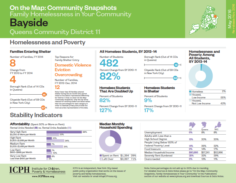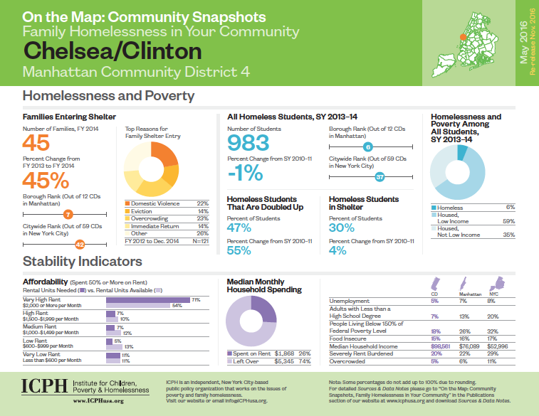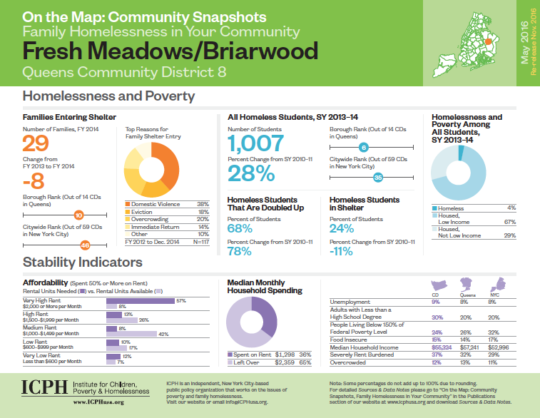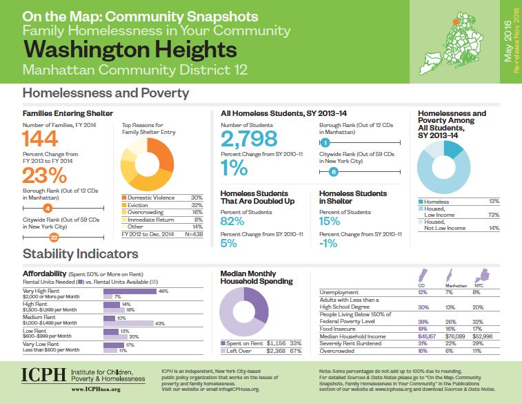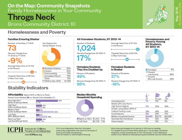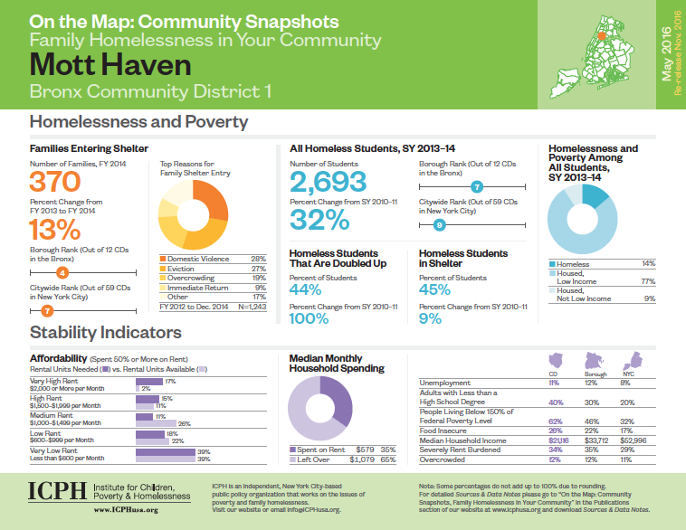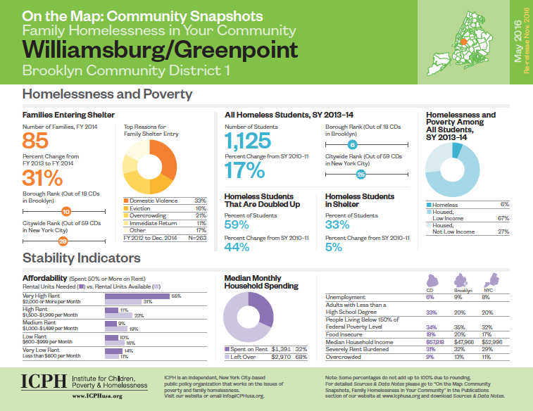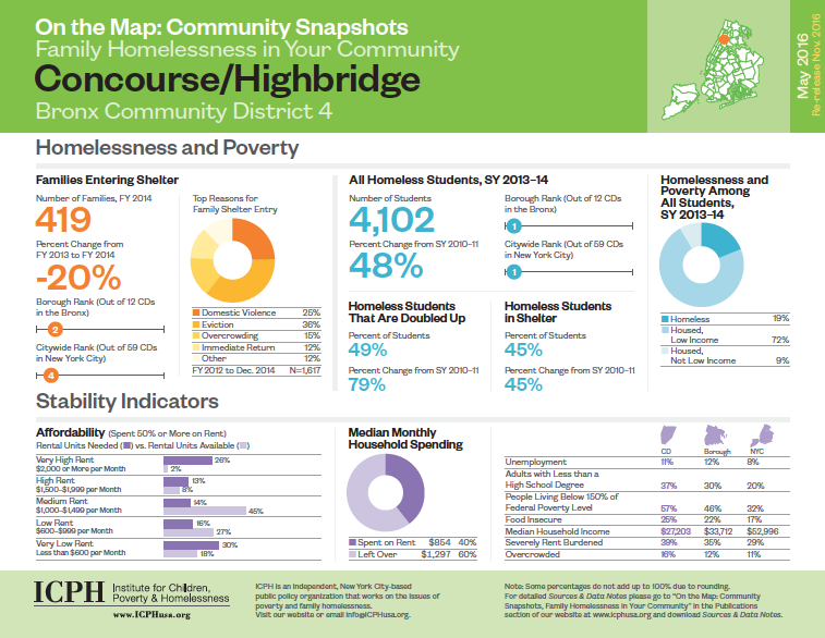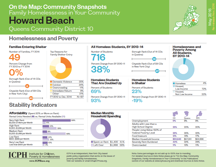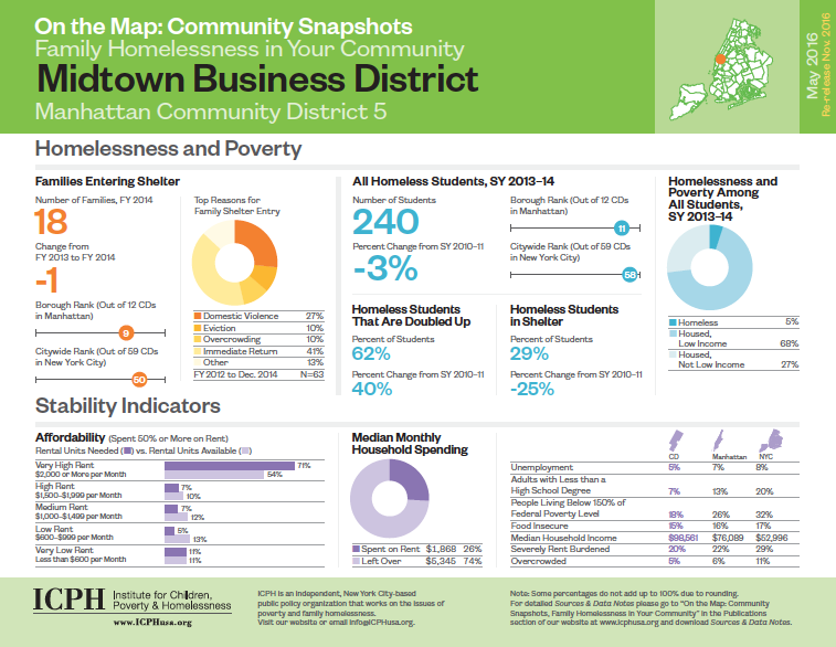 On the Map: Community Snapshots continues the work of our On the Map series by providing quick, one-page snapshots that look at the key factors impacting family homelessness at the community level. This helpful resource examines family homelessness by New York City Community District, analyzing key elements such as shelter entry data and the extent of student homelessness. Each snapshot also details the stability indicators of each community, from the affordability of rental units to unemployment rates.