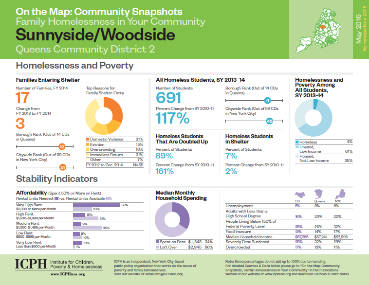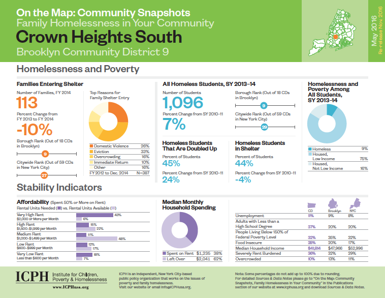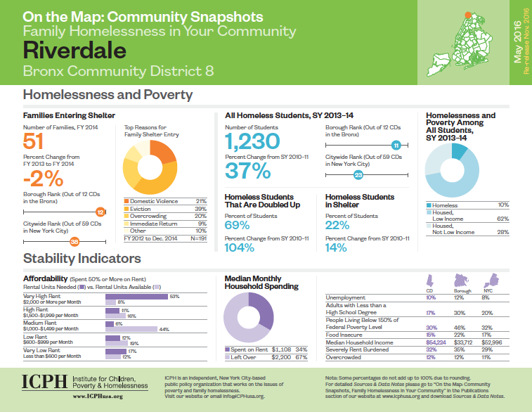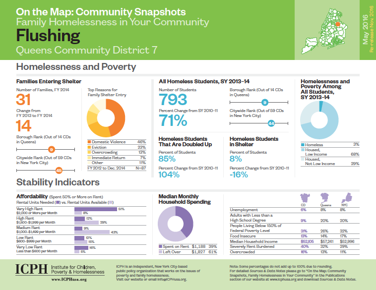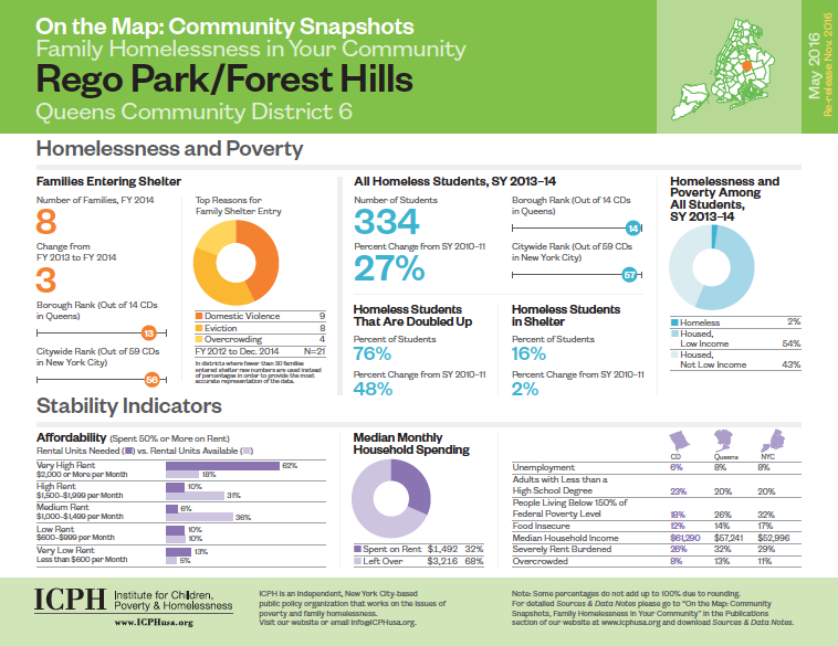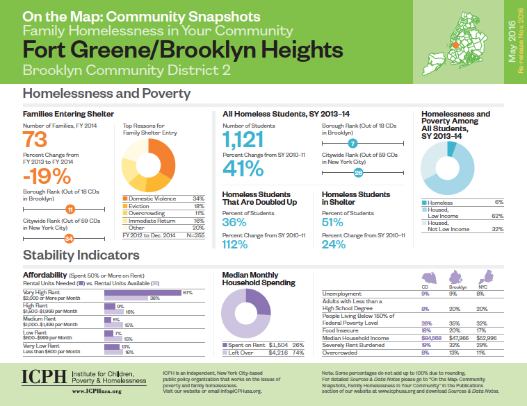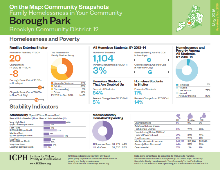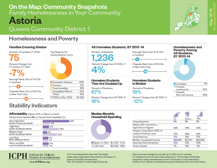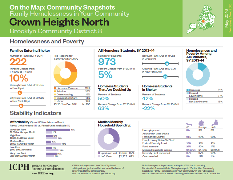On the Map: Community Snapshots continues the work of our On the Map series by providing quick, one-page snapshots that look at the key factors impacting family homelessness at the community level. This helpful resource examines family homelessness by New York City Community District, analyzing key elements such as shelter entry data and the extent of student homelessness. Each snapshot also details the stability indicators of each community, from the affordability of rental units to unemployment rates.