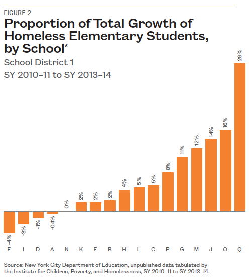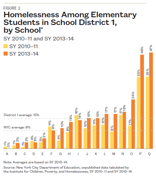 - Rates of homelessness among elementary students in School District 1 varied dramatically by school. While 15% of elementary students overall were homeless in SY 2013–14, homelessness in individual schools ranged from 0% in one school to 47% in another. In New York City on average 9% of elementary students were homeless in SY 2013–14.
