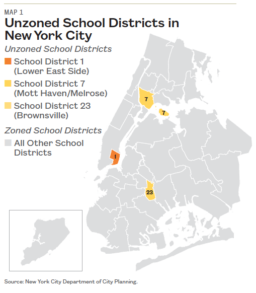 School choice plays a significant role in public education, whether determined by where you live (zoning) or other ways in which families select schools, such as vouchers or charter schools. In New York City, officials support families in having choices for their children, resulting not only in the rapid growth of charter schools, but also in the creation of three unzoned school districts.1 In these districts, elementary school enrollment is not based on a student’s address, but on parental choice and a lottery system when school applications exceed capacity. Importantly, all three unzoned districts serve communities where the number of homeless students exceeds the citywide average (Map 1), and District 1’s homeless student population is two times higher than the average.2 If school choice is another tool in the New York City Department of Education’s (DOE) belt to level the playing field and provide opportunities for disadvantaged students, what does it mean if the unzoned districts are in fact increasing segregation?