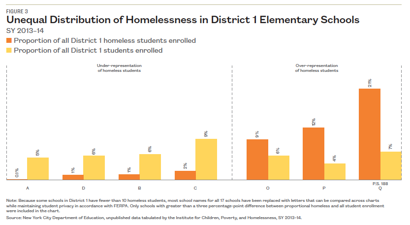 - District 1 was the most segregated school district in New York City by housing status, with over 20% of homeless elementary students attending just one school in the district.