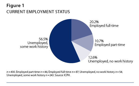 To better understand employment among homeless families, ICPH surveyed homeless parents in 2011 with regard to employment status,7 education level, parent and child age, occupation, and perceived barriers to employment. Parents fell into four distinct categories: employed full-time, employed part-time, unemployed with a work history, and unemployed with no work history. As expected, levels of employment among homeless heads of household were far below those of the rest of the city, as just 31% of parents had paid positions, with 65% of those working full-time. The majority of parents (56.5%) were unemployed but had worked before. However, over 12% were unemployed and had no work history at all (see Figure 1). These rates are consistent with recent anecdotal reports that approximately 30% of homeless parents are employed.8