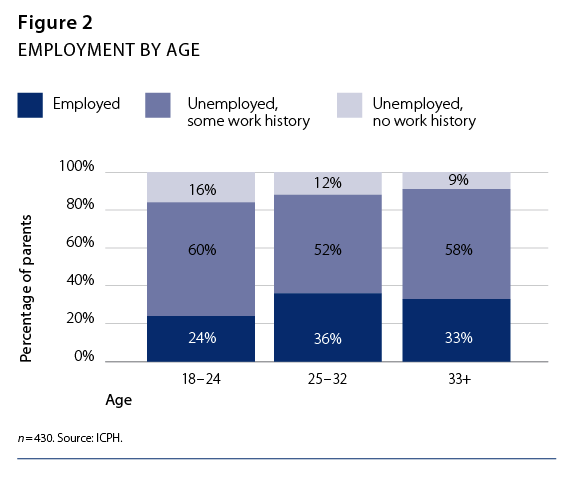 The number of parents with no work history decreased as age increased, from 16% for younger parents (aged 18–24 years), to 12% among 25-to-32-year-olds, to 9% for older parents (33 years and older). This relationship follows the expected trajectory, since older parents have had more opportunity to gain experience in the job market. However, the level of employment did not follow a parallel pattern, as parents in the middle age range (ages 25–32) represented the highest percentage of those currently employed (36%; see Figure 2).