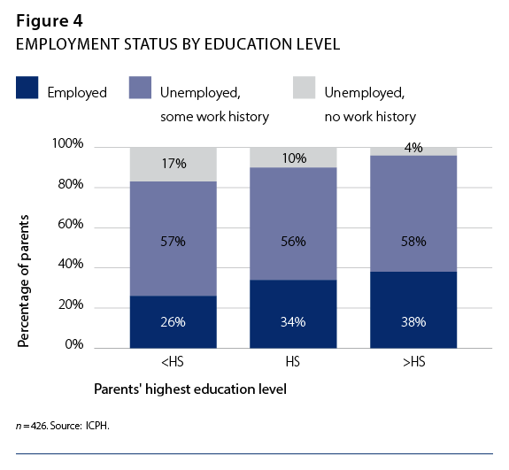In addition to parent age and trauma history, education levels provide insight into low employment rates. Higher levels of educational attainment were associated with employment among sampled parents. While one in four (26%) of those with less than a high school diploma were working, the number rose to one in three (34%) for those with a high school diploma and increased to 38% for parents with higher levels of education. Parents with more than a high school diploma are 31% more likely to be employed. This points to the importance of continuing efforts to promote high school completion and GED attainment. Education level also factored into the likelihood that a parent would have some past work experience; the percentage of heads of household without any work experience went from 17% among non–high school graduates to 4% for those with more than a high school diploma or GED. Education level did not, however, greatly influence levels of unemployment, which were steady between 56% and 58% for all three groups among those with work experience (see Figure 4). Again, this reinforces the view that employment services should be targeted to the specific needs and situations of different groups.