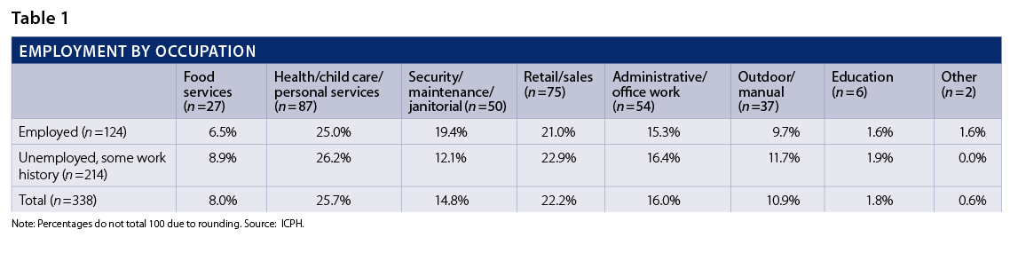 While having a job is a step in the right direction, it does not always ensure that a family can make ends meet. The vast majority of homeless parents currently work or recently worked in low-wage jobs. The category in which the greatest number of heads of household had worked was health, child care, and personal services (26%), which includes the jobs of home-health aides, child-care workers, and beauticians (see Table 1). An additional 21% of employed and nearly 23% of unemployed parents worked or had worked in retail or sales, and 16% performed or had experience doing administrative or office work.