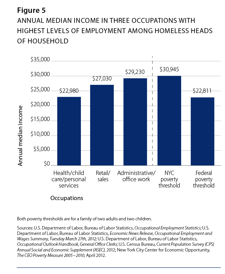 While the average hourly wage in New York State for these occupations is well above the minimum wage of $7.25 per hour ($11.05 for home-health aides,12 $13 for retail workers,13 and $14.05 for administrative office workers),14 these rates do not provide an annual income above the New York City poverty threshold for full-time workers15 (see Figure 5). In addition, many homeless breadwinners may not make the mean wage or work full-time. Also problematic is that these jobs are often the most inflexible, with parents penalized for taking time off to care for sick children, forcing some families to choose between caregiving responsibilities and employment.16 Recently passed legislation mandating sick leave in New York City will hopefully aid parents who are juggling family and work needs.