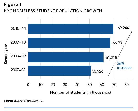 Meeting the educational needs of homeless students in New York City is not a new challenge, but it is a growing one. With their numbers steadily climbing in the last five years, the need to find innovative ways to do so has become even greater. In 2007 homeless children made up 5% of the student body, at 50,926 students. By 2010 that number had swelled 36%, to 69,244, representing 7% of the total population (see Figure 1).3 This increase comes as no surprise, as the number of homeless families has reached a new record and is likely to keep rising.4