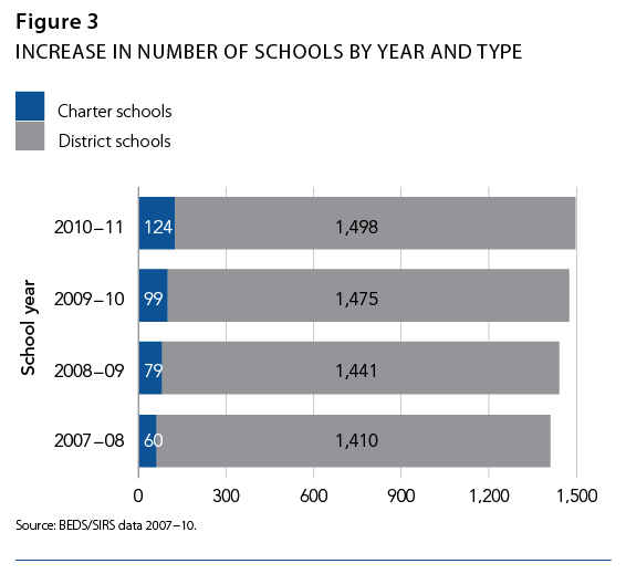 Demand has also led to a rapid increase in the founding of new charter schools. Since 2007 New York City has seen the number in operation double, from 60 in SY 2007–08 to 124 in SY 2010–11 (see Figure 3).16 The majority cater to elementary education. While charter schools still represent a small portion of the total number of schools in New York City, at 8%, up from 4% in 2007, the number is likely to grow, as the push for more charter schools shows no sign of abating.