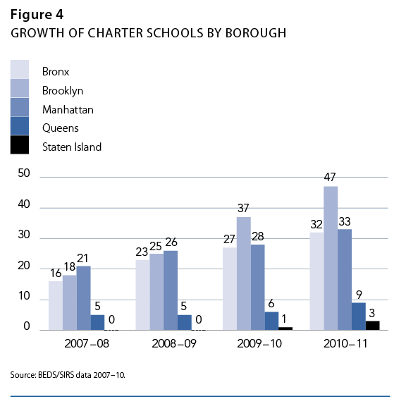 Charter-school openings have not materialized evenly across all five boroughs, however. In 2007 Manhattan led the city in the number of charter schools, with 21 in operation, while Brooklyn was home to 18. Although Manhattan has steadily added charter schools every year, housing 33 in 2010, Brooklyn has surpassed all boroughs. In just four years Brooklyn opened 29 new schools, nearly tripling the number of schools in its environs to a total of 47 (see Figure 4). Queens, on the other hand, has lagged in the creation of charter schools, adding only four in the four-year period.