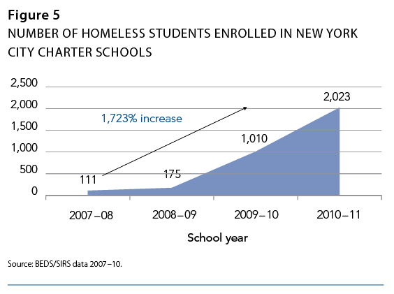 Charter schools were introduced to New York City in 1999 to inject new life into the nation’s largest education system. Fourteen years later, the debate over whether these institutions succeed in helping the city’s neediest students remains front and center. While only 4% of New York City’s more than one million students currently attend charter schools, the last several years have seen an exponential increase in the charter-school enrollment of homeless students1: an astounding 1,723% from 2007 to 2010.2 Even though their total number remains small, at just over 2,000 students citywide, such a large and rapid increase cannot be ignored. Little is currently known about how these hardest-to-reach students fit into New York City’s charter-school experiment. Using data from the Basic Educational Data System and its successor, the Student Information Repository System, from school year (SY) 2007–08 through SY 2010–11, this report seeks to provide a snapshot of the charter-school system in New York City and raise important questions about its role in the education of homeless students.