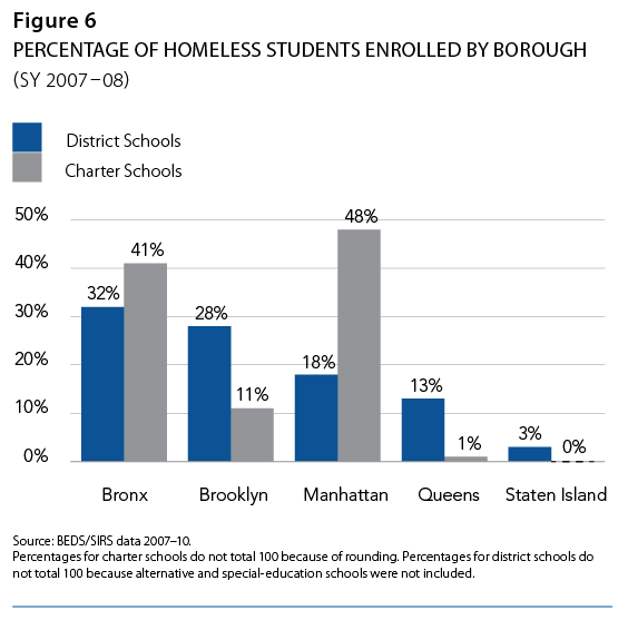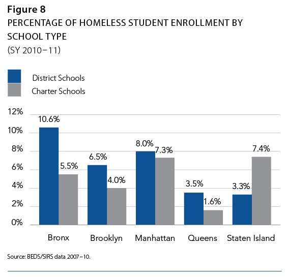 16 This is based on the 138 charter schools listed in the SIRS SY 2010–11 data. The number of charter schools is greater than the 124 mentioned previously because for the purposes of progress-report grades, sites that house both an elementary and middle school, a middle and high school, or grades K–12 are separated. Raw numbers of schools may vary depending on data source accessed, as some sources list schools that house elementary, middle, and/or high schools in the same building as more than one school. Only schools open for enrollment were included in this analysis. New York State Technical and Education Assistance Center for Homeless Students (NYS-TEACHS), “NYS-TEACHS › Info by Topic: Data and Statistics on Homelessness,” Data Files SY 2007–08, SY 2008–09, SY 2009–10 and SY 2010–11.