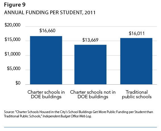 22 Domanico, Ray, and Yolanda Smith. “Charter Schools Housed in the City’s School Buildings Get More Public Funding per Student than Traditional Public Schools,” Independent Budget Office Web Log, February 15, 2011. 23 New York State Education Department: No Child Left Behind, “Field Memo #03-2010: New York City Charter Schools and Community School District Preference for Homeless Students,” 2010.