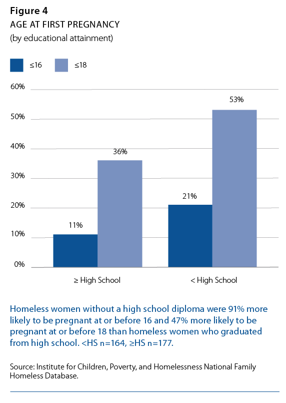 According to the Centers for Disease Control, the average age of sexual onset for young women nationally is 17.4 years.4 For homeless women, however, sexual initiation occurs nearly one year earlier, at age 16.5.5 When the data is controlled by educational attainment, a story emerges that speaks to the significance of a high school degree: of those women who did not complete high school (48%), 21% had had sex at or before age 14 and 66% at or before age 16, while only 12% of women who achieved a high school education or more were sexually active at age 14 or before and 53% at age 16 or before. (See Figure 1.) Though it is tempting to interpret the relationship between sexual decision making and educational attainment as causal, it may be more accurate to view both poor family planning and lack of schooling as outcomes of multiple interacting factors associated with poverty.