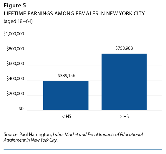 Greater educational attainment is associated with a more active role in reproductive choices. One in five (21%) homeless women who did not complete high school were pregnant with their first child at or before age 16, and more than half (53%) were pregnant at or before 18. (See Figure 4.) Those who completed high school or above became pregnant for the first time later—11% at or before age 16 and 36% at or before 18. Research suggests that young women are more likely to become pregnant after dropping out of high school, and completing high school with a baby in tow proves a goal many young mothers fail to reach.14 Young mothers without high school diplomas or GEDs will likely earn comparatively little money over their lifetimes, working few hours with low wages and increasing the probability of homelessness and reliance on public assistance. In fact, those women who fail to complete high school earn nearly 50% less over their lifetimes.15 (See Figure 5.)