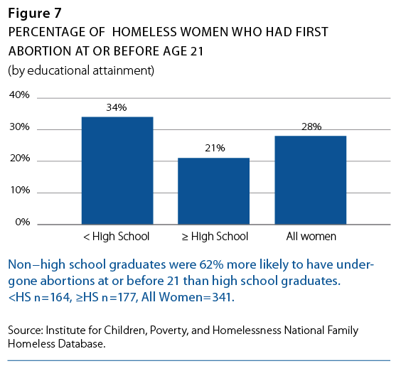 Additionally, with so many women becoming sexually active and pregnant at such a young age, many of them undergo abortions. Of all homeless women, 28% had abortions at or before the age of 21. Yet, again, educational attainment mediated the relationship. Over one-third of women (34%) who did not complete high school first underwent abortions at or before 21, as opposed to 21% of women with high school diplomas. (See Figure 7.) This is consistent with the lower levels of contraception use and younger age of sexual initiation among non–degree holding homeless women, suggesting that young women with weaker ties to education obtain more abortions. Although one could argue that increased frequency of abortions results from teens’ feeling unready to have children, the high number of young women who deliver babies seems to undercut that suggestion.