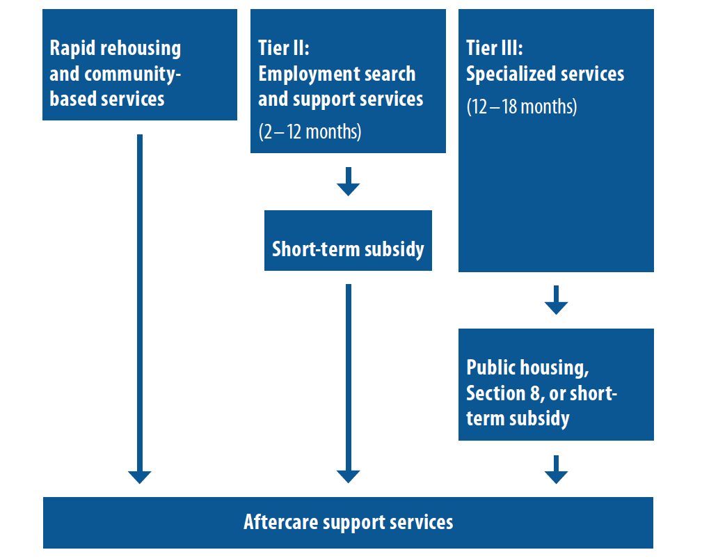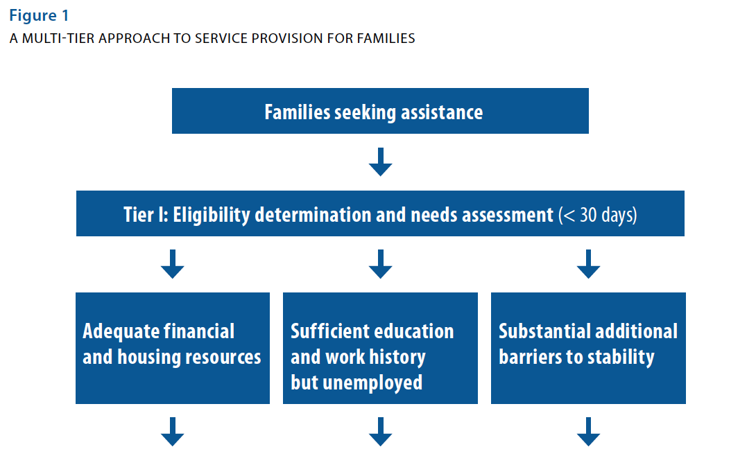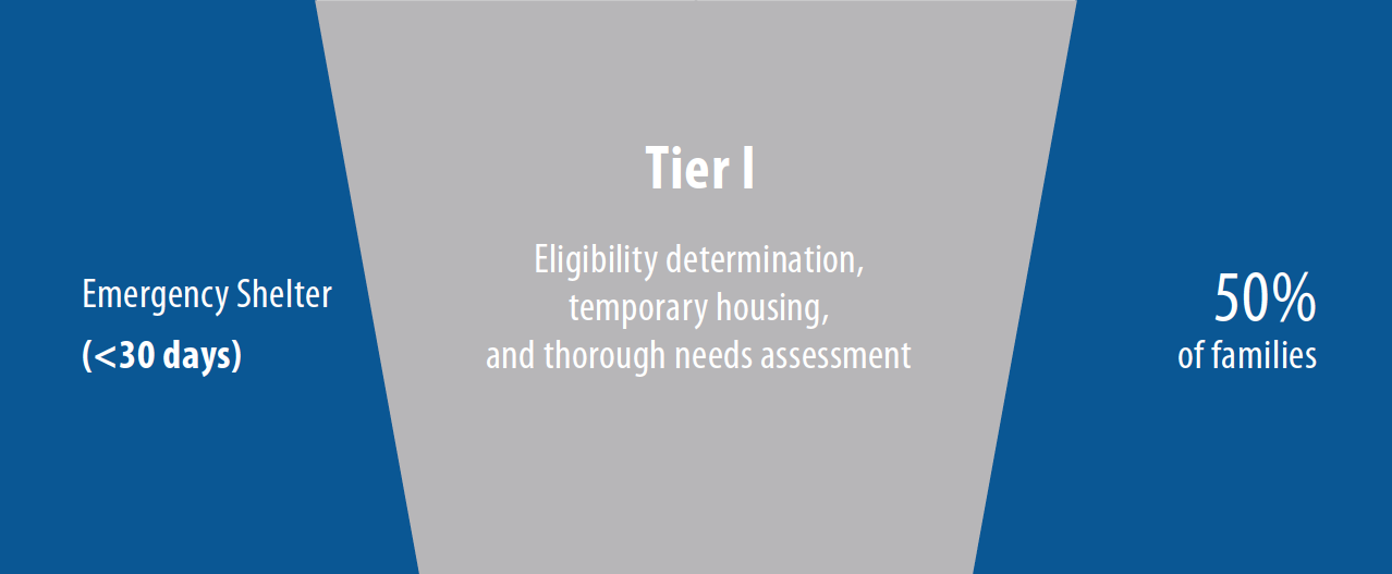 In the interest of families in need and the system as a whole, it makes sense to structure the emergency housing system according to these evident varying levels of need. Central to this proposal, then, is a refined system of multi-tier services. Tier I will address the most immediate housing needs of families applying for assistance. For many families, a month or less of assistance at Tier I will prove sufficient to help them reestablish housing. Those families who, during Tier I placement, present a need for additional, but still moderate, support will access Tier II services. For most of the families in the Tier II category, roughly six months of assistance will be adequate to meet their needs. Families who identify the greatest service needs during the initial intake and placement will be offered the opportunity to enroll in a Tier III program, through which they will receive support over the course of 12 to 18 months in core service areas (employment, education, domestic violence, child welfare, mental health, and substance abuse) according to their identified need.