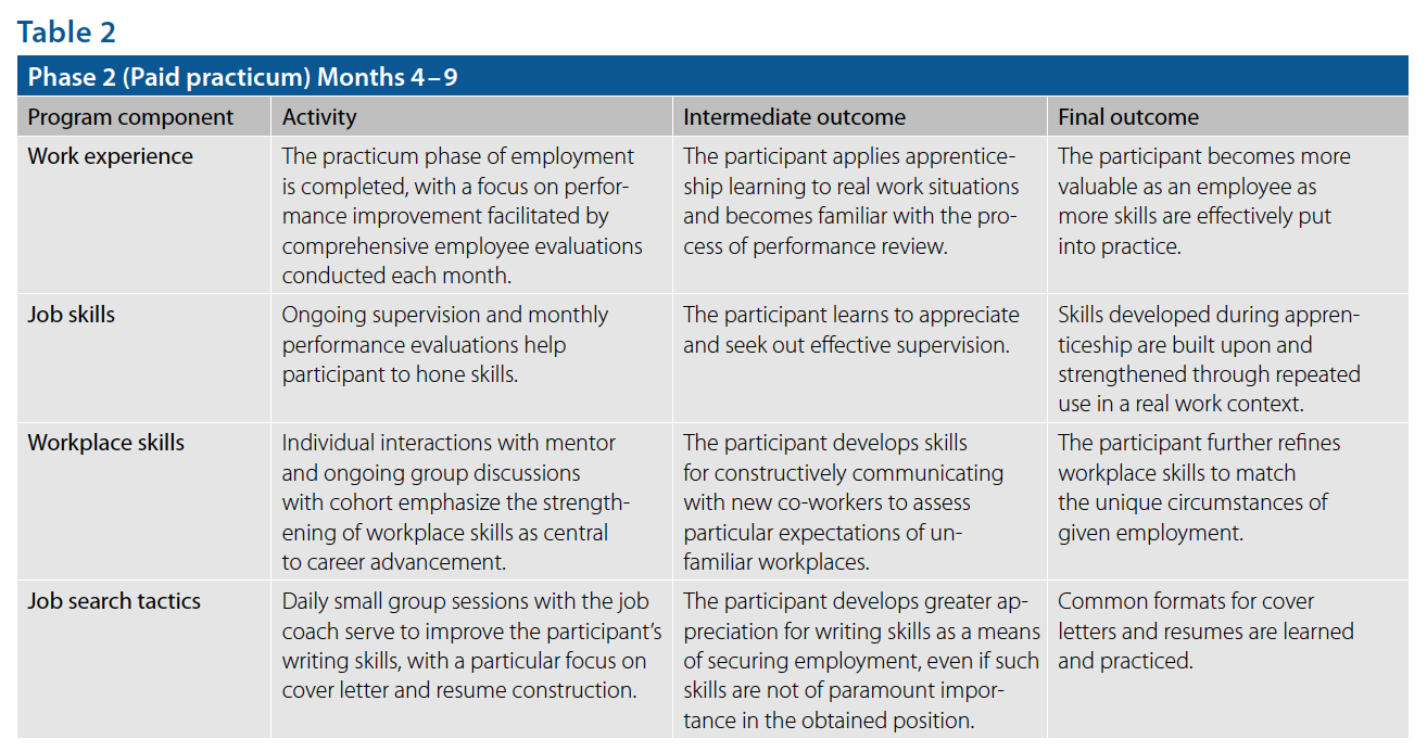 During this final phase, interviewing skills are practiced and refined in weekly group sessions, with members taking turns playing the part of applicant and employer and providing one another with constructive criticism.