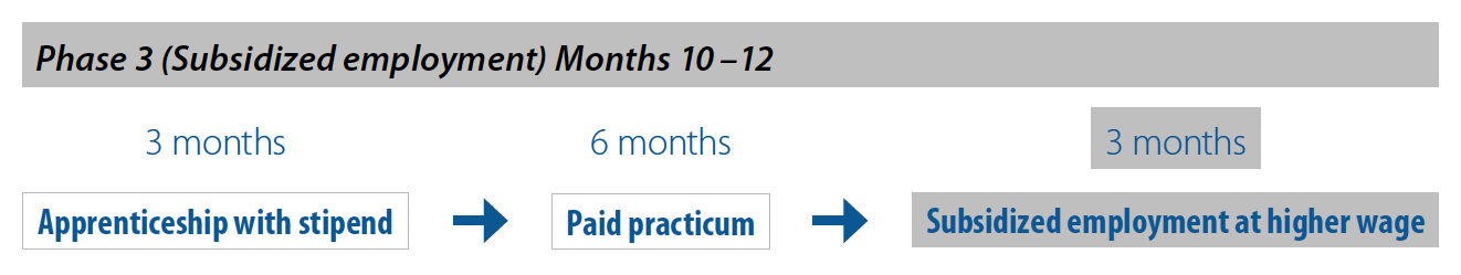 More advanced students will enter directly into the test-preparation track while others will enter this phase only after completing either the adult basic education track or the subject-refresher track. For all, this final education phase of the program will be completed in two to three months, depending on the student’s capacity to achieve a passing grade on the GED practice tests. Proven success on the practice tests will lead to scheduling of the actual test. Once students obtain their GED, the student resident will be reassessed for eligibility in a Tier III Advancing Employment Program.