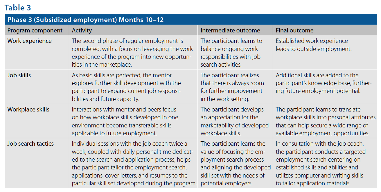 Individual sessions with the job coach twice a week, coupled with daily personal time dedicated to the search and application process, help the participants tailor the employment search, applications, cover letters, and resumes to the particular skill set developed during the program. Participants learn the value of focusing the employment search process and aligning the developed skill set with the needs of potential employers. In consultation with the job coach, participants conduct a targeted employment search centering on established skills and abilities and utilize computer and writing skills to tailor application materials.