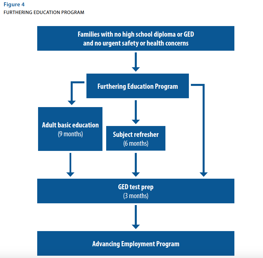 The Tier III Furthering Education Program will work exclusively to prepare participants to pass the GED test. Heads of household will be the primary focus of this intervention, although dependent children who have dropped out of school will also be eligible for course enrollment. Preparation for the GED exam will be tailored to the skill level of participants, with similarly skilled individuals grouped together to facilitate timely progress.