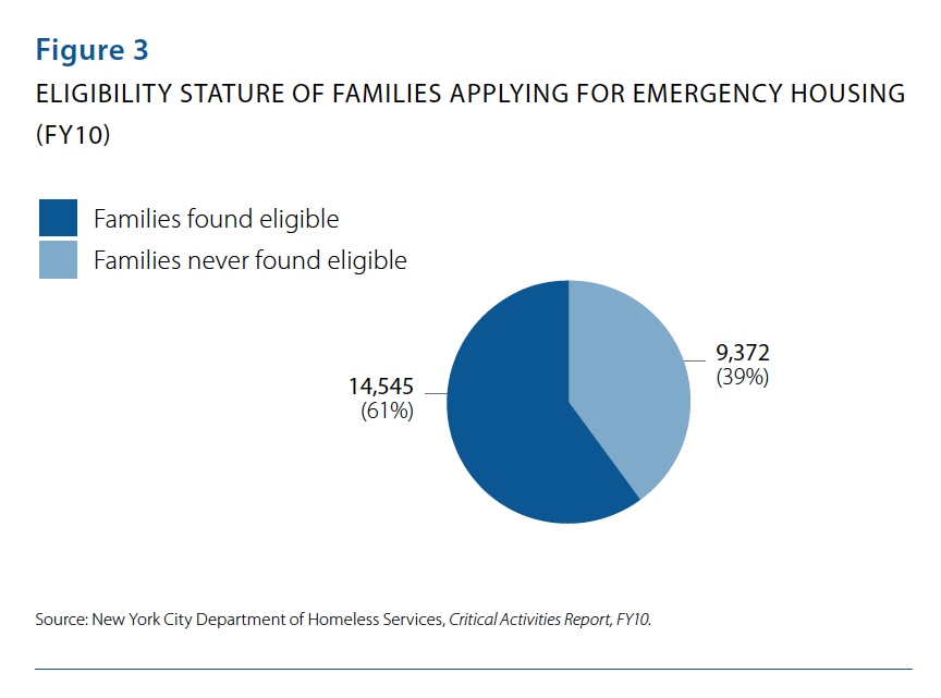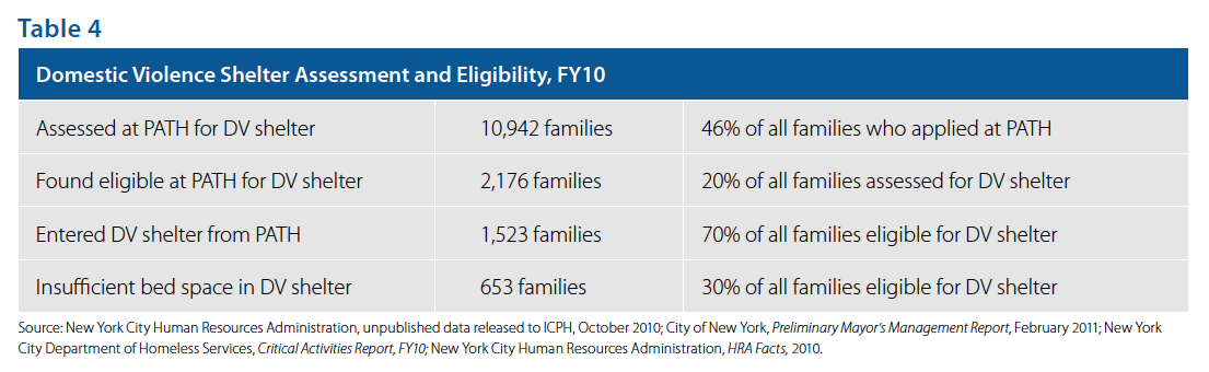In Fiscal Year 2010, nearly half of all families applying for emergency housing assistance in New York City were referred for further domestic violence assessment based on reports of abuse presented at intake. Of those completing this further assessment, 20% were found eligible for placement in a domestic violence shelter. However, due to limited capacity, only 70% of applicant families were able to receive these critical domestic violence services. The rest of the 650 families fleeing domestic violence, all with verified safety concerns, were forced to make do with placement in the mainstream shelter system, a solution that compromised family safety and well-being.1