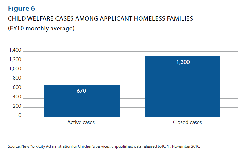 On average, 670 active child welfare cases and 1,300 closed cases were identified each month among applicant homeless families in New York City in 2010.
