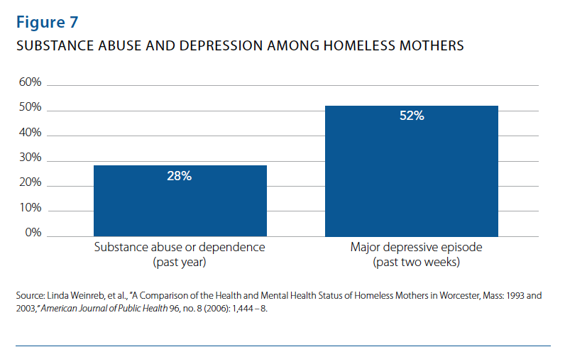 Mental illness and substance abuse loom large among homeless single adults. Recognizing the pervasiveness of these obstacles among the adult population, policymakers opted to interweave mental health and substance abuse support services with housing services, a multi-pronged approach to service delivery that is now the norm among homeless single adults.