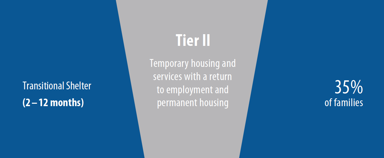 This tier also looks almost identical to the current system. These families who enter the system stay for between two and 12 months. Most of these heads of household have some sort of education and work histories, and need help getting back on their feet and securing housing. These families are served well by the current system of family case managers and housing specialists in finding new or better employment and affordable, market-rate housing. They do not usually return to the shelter system.