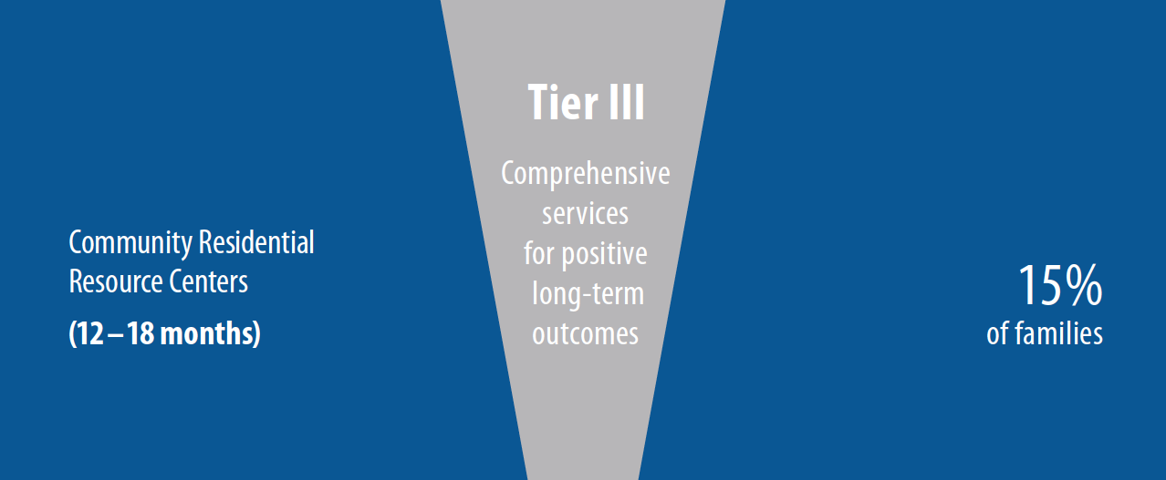 Families who identify more complex needs and have higher barriers to maintaining permanent housing would be eligible for a specific type of shelter program, which would be called a Tier III program, or a Community Residential Resource Center (CRRC). Tier III CRRC programs would be specialized programs designed with specific outcomes identified. Tier III CRRC programs would focus intensively on education and employment, as well as domestic violence and child abuse/neglect prevention, and substance abuse treatment as needed. Each of these models is described in more detail in the following pages.
