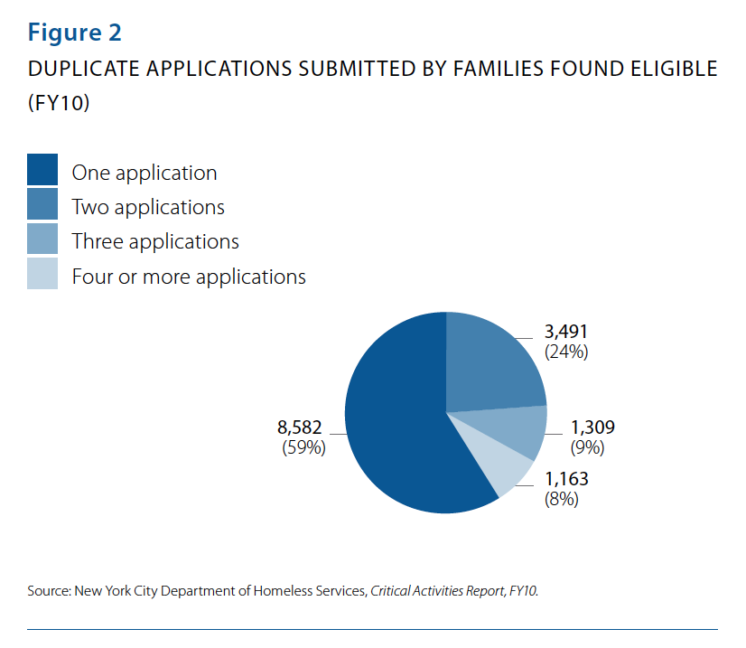 In the current system, conditional placements are limited to ten days, but data show that this is insufficient time to accurately determine eligibility. That is, of all families eventually found eligible for shelter, less than 60% are found eligible on their first application.7 One-third of all families eventually found eligible must submit two or three applications before receiving a favorable determination. This means these families cycle through conditional placement for 2 –30 days before being found eligible.