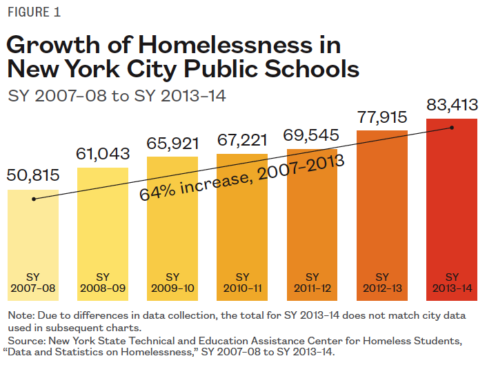 The number of homeless students in New York City Public Schools has risen by 64% since SY 2007–08 even as total enrollment remained constant. As seen in Figure 1, over 83,000 students attended school during the 2013–14 school year while living in some type of temporary housing, such as a family shelter or doubled up in another family’s residence due to loss of housing or economic hardship.